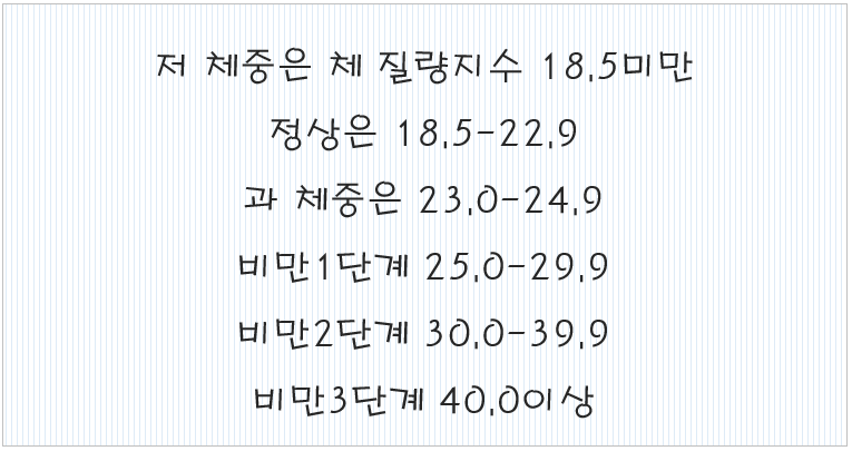 키 대비 무게를 수치화함으로써 비만도를 알아볼 수 있는 방법입니다.
